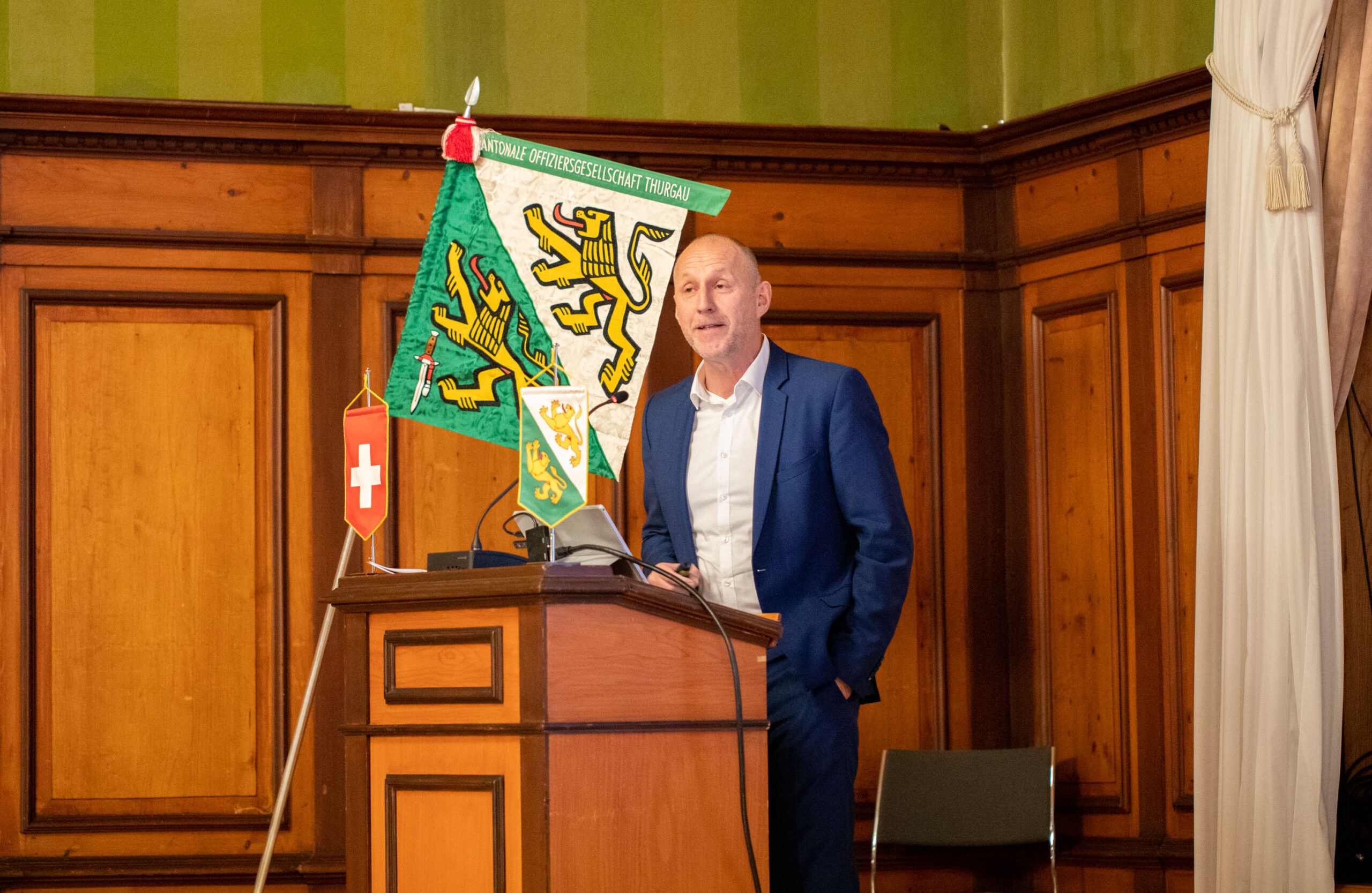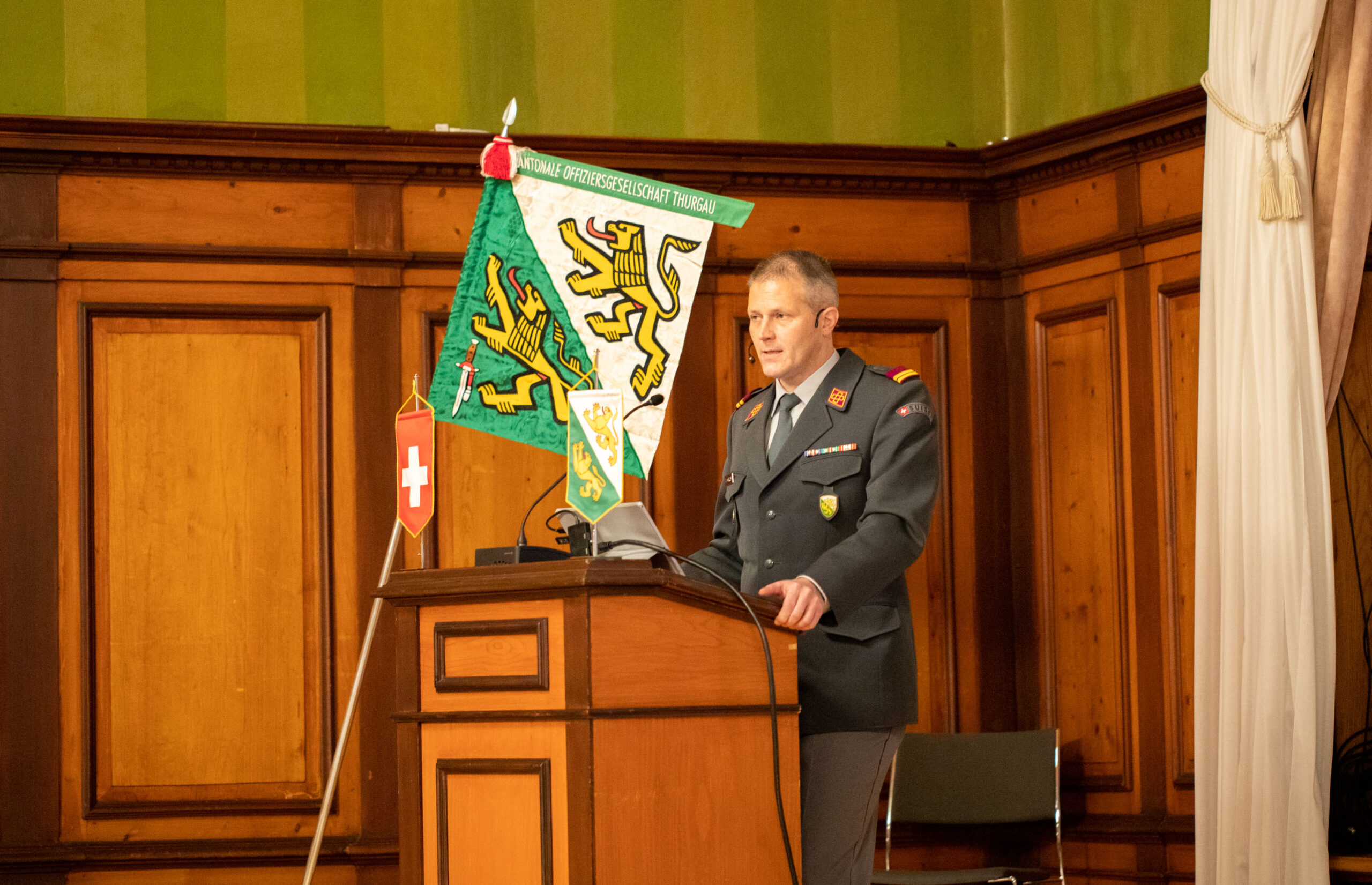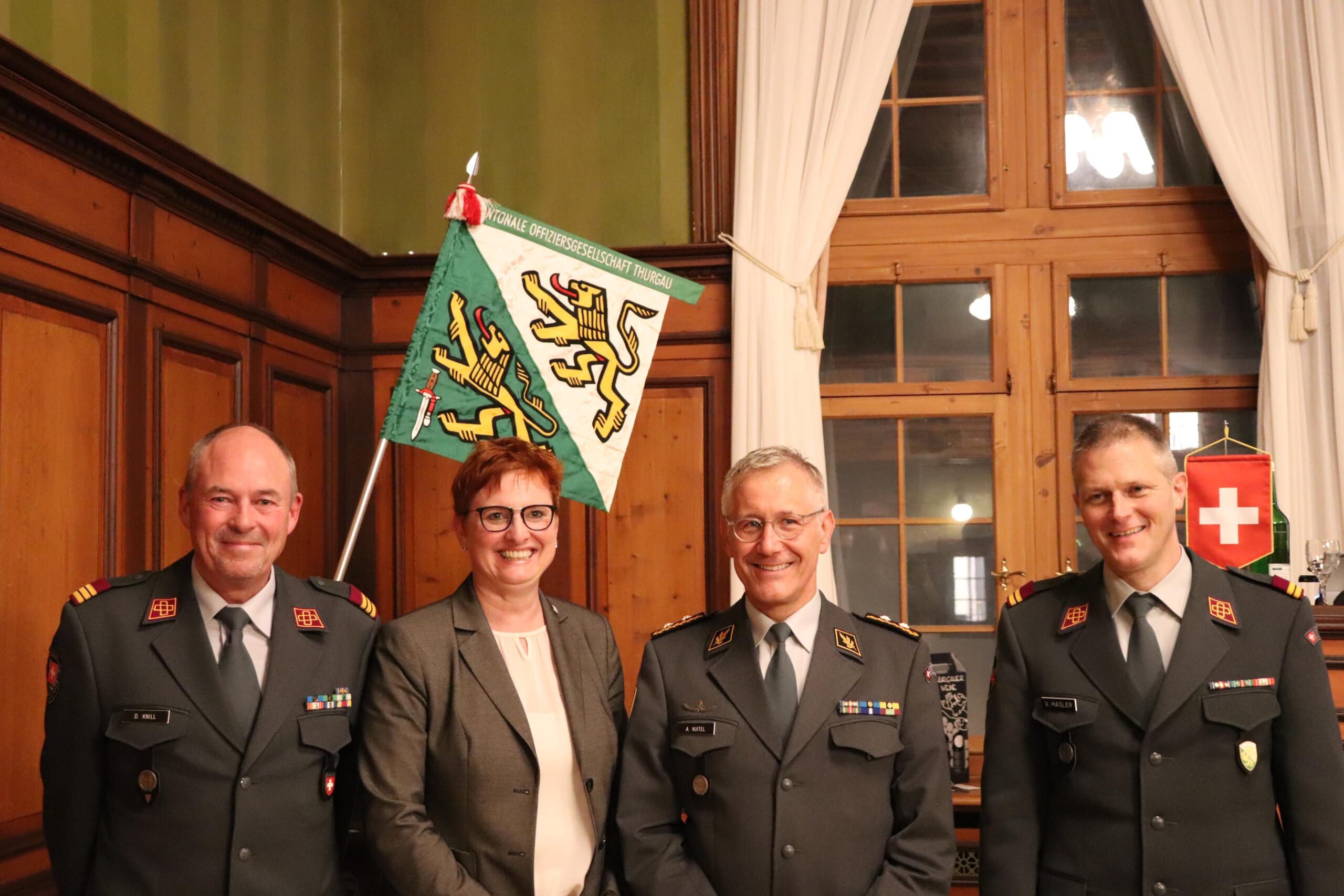 Rund 70 Vereinsmitglieder und eine erfreuliche Anzahl an Gästen versammelten sich im Rathausaal Weinfelden. Oberstleutnant Valentin Hasler, Stadtrat und seit einem Jahr Präsident der KOG TG, führte den Anlass. Als Gäste konnten Barbara Dätwyler, Kantonsratspräsidentin, Oberst Dominik Knill, Präsident der Schweizerischen Offiziersgesellschaft sowie Divisionär Alain Vuitel gewonnen werden.