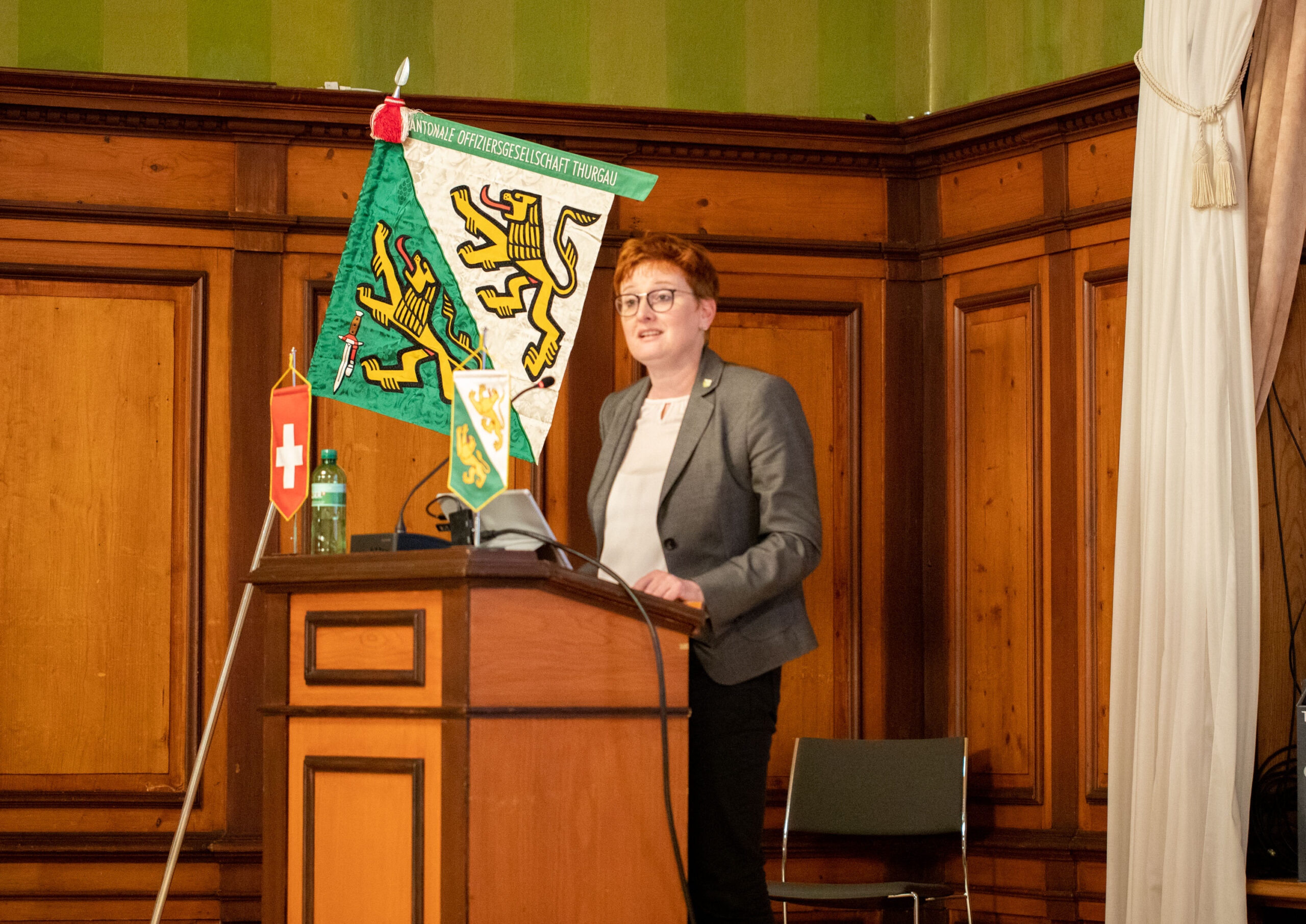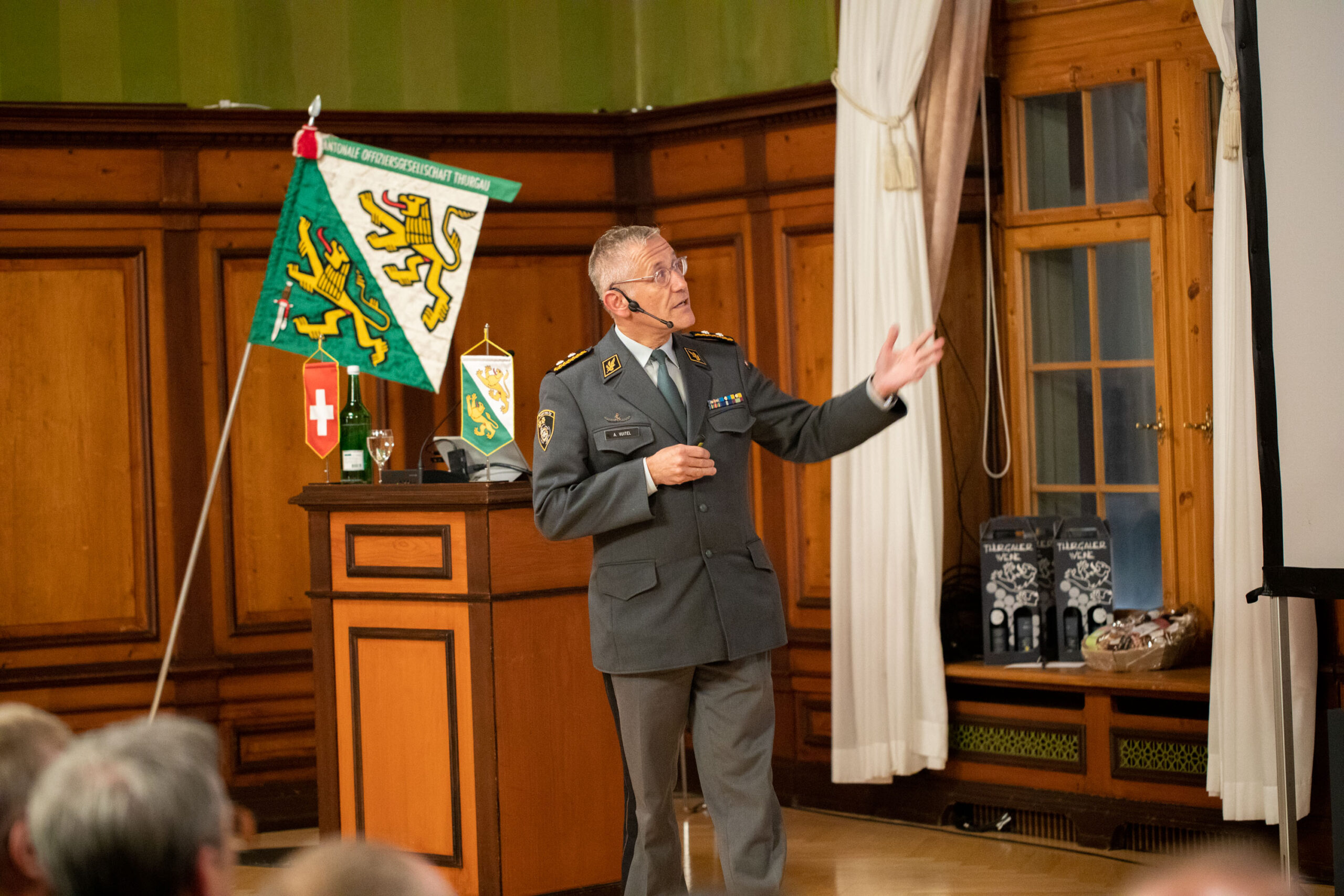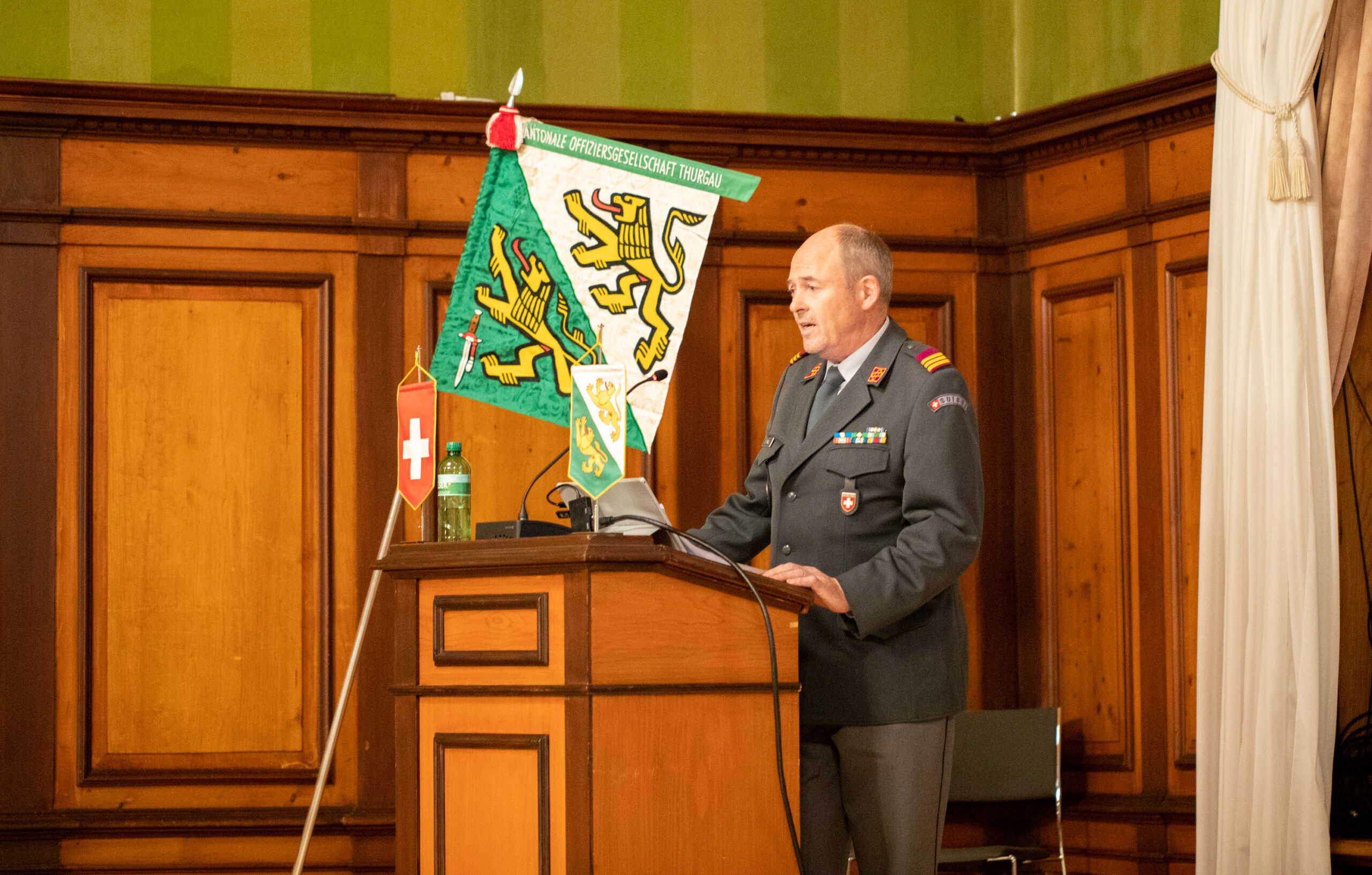 Rund 70 Vereinsmitglieder und eine erfreuliche Anzahl an Gästen versammelten sich im Rathausaal Weinfelden. Oberstleutnant Valentin Hasler, Stadtrat und seit einem Jahr Präsident der KOG TG, führte den Anlass. Als Gäste konnten Barbara Dätwyler, Kantonsratspräsidentin, Oberst Dominik Knill, Präsident der Schweizerischen Offiziersgesellschaft sowie Divisionär Alain Vuitel gewonnen werden.